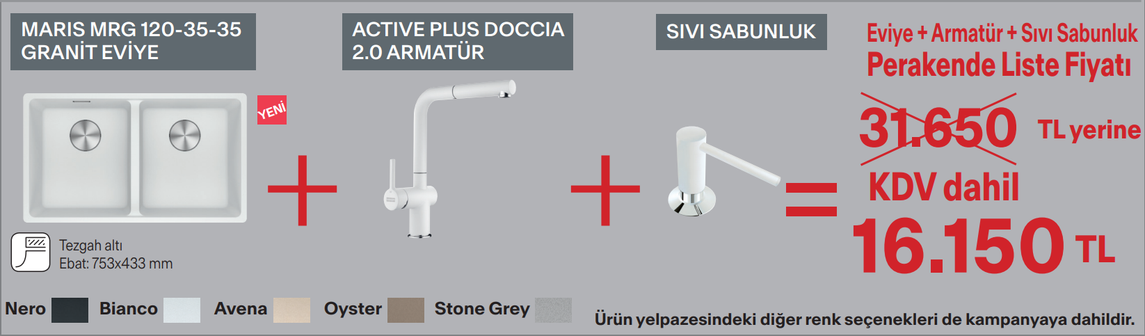 Franke Maris MRG 120-35-35 Tezgah Altı Oyster Evye + Active Plus 2.0 Oyster Armatür + Active Comfort Sıvı Sabunluk Kampanyası
